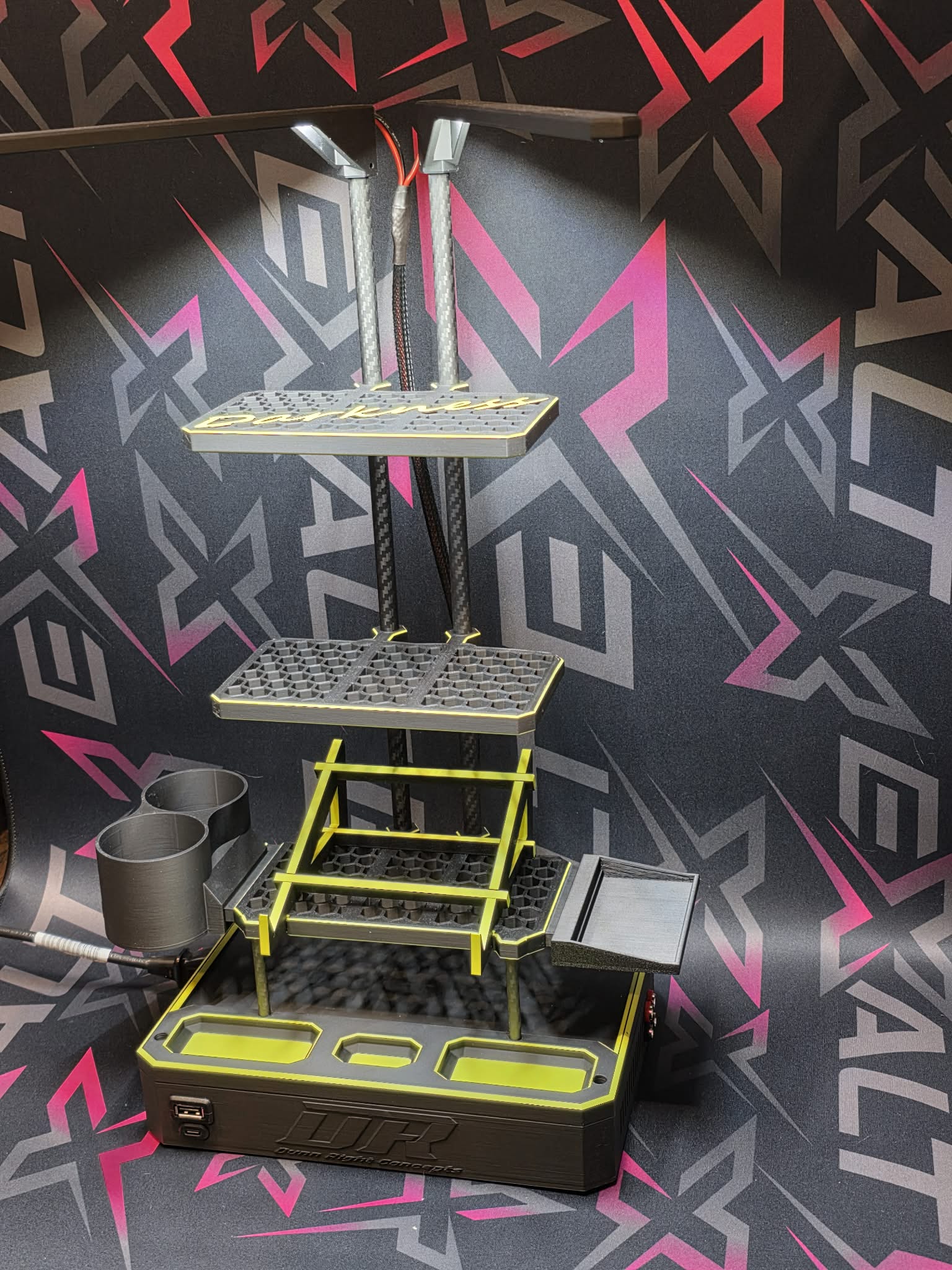 This pit stand is an all in one unit. This unit will hold your Icharger on the lower shelf just above your power supply. That still leaves your two more shelfs for car storage. There is also a built in 120w power supply to power your tire warmers, change your radio or other accessories you may have. This also eliminates the need to cary extra pit lights as they are also built into this unit. Need a USB plug? How about 6 of them, along with 4 sets of 4mm bullets for your accessories that require bullet plugs. Tired of spilling your tire prep? This has a spot for that too. What about your discharger? Your in luck. There is a special shelf designed to support the Team Exalt discharger aswell. Disclaimer, this is not designed to power the charger itself. It will cause damage if attempted. Charger should be plugged directly into your power supply. Bullets and USB plugs are designed to operate accessories such as tire warmers, radio chargers, and other accessories.
